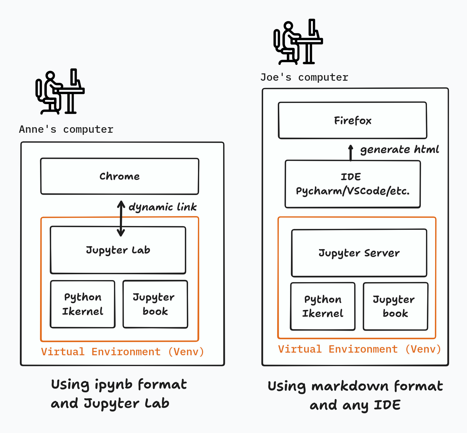focus on recording a computation (e.g. Jupyter) vs. publishing (e.g. Quarto)